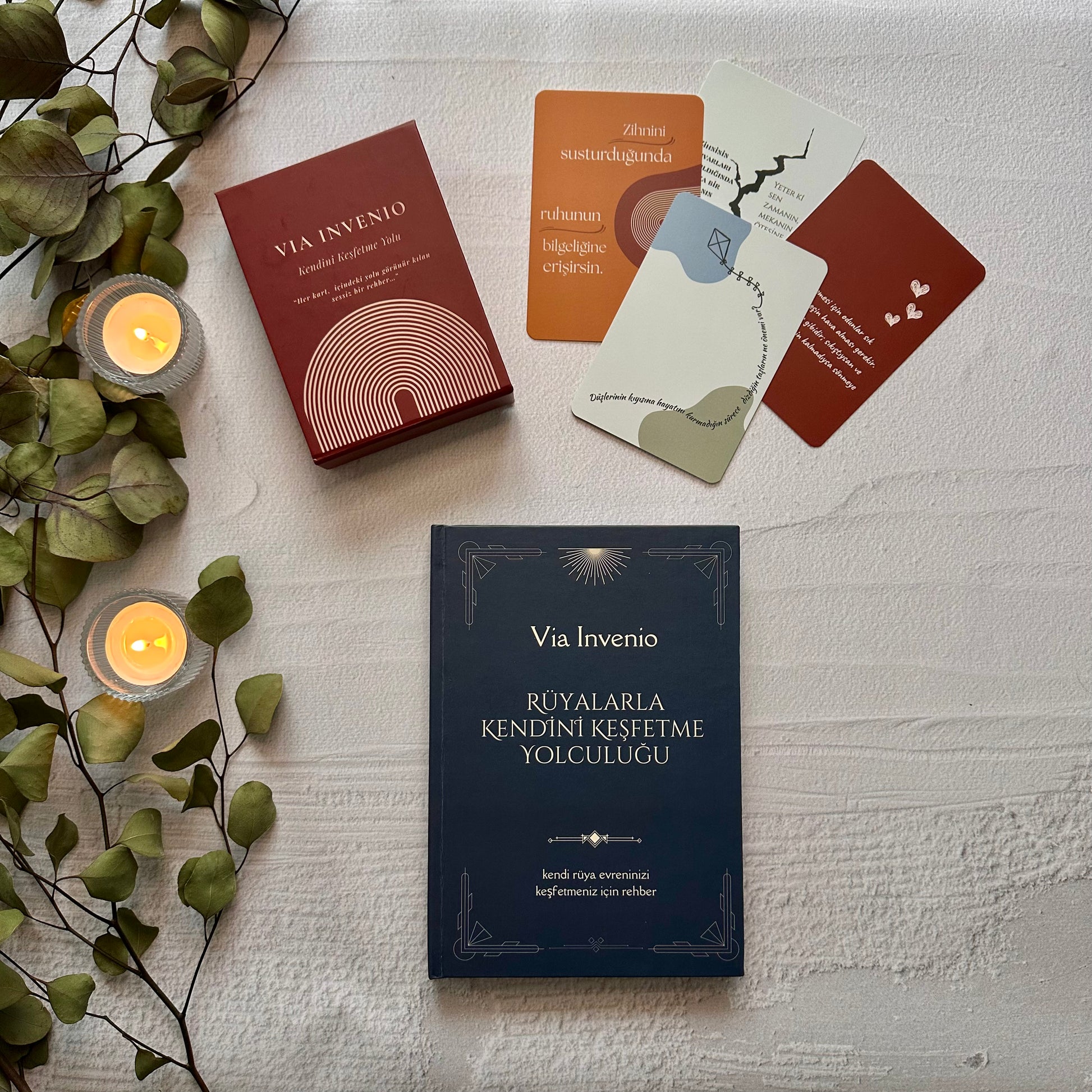 Rüyalarla Kendini Keşfetme Yolculuğu Defteri ve VIA INVENIO Kart Destesi, rüyalarınla bağını derinleştirmek ve iç dünyandan gelen mesajları fark etmek için bir araya getirildi.